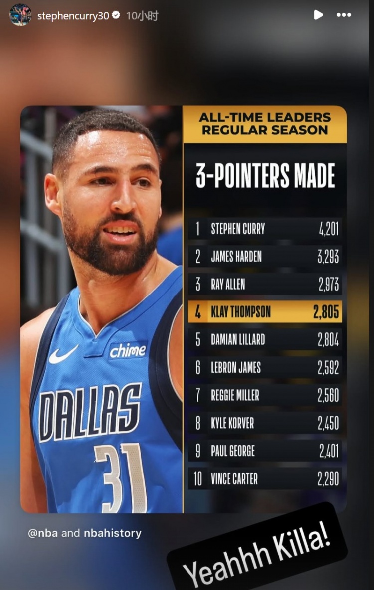 克莱的生涯三分球命中数超越利拉德,上升至NBA历史第四位;今天,库里转发评论道:“耶,杀手!”
