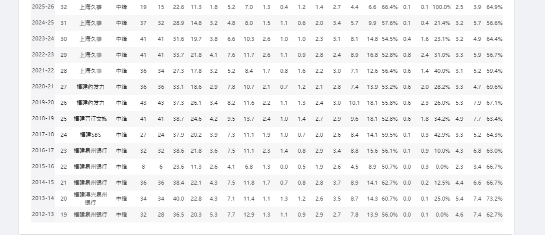 在福建男篮生涯的后八个赛季,王哲林更是有6个赛季常规赛,全部以首发身份出战。所以不止新秀第一年就是球队老大,他算是每个赛季都是球队核心。王哲林也不负众望,在福建队书写了“出道即巅峰”的职业生涯开篇,新秀赛季便交出场均20.3分12.9篮板的两双数据。