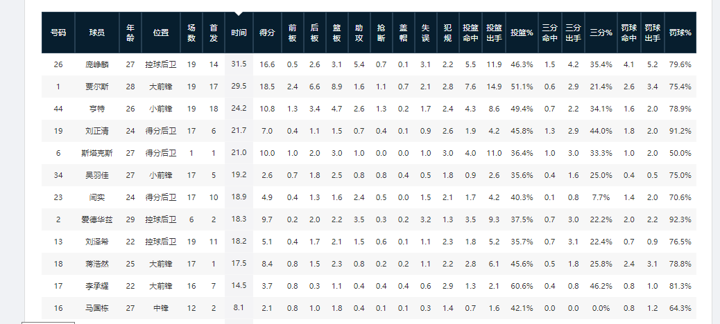 截至CBA25-26赛季第19轮,庞峥麟共出场19次,14次首发,场均出场时间31.5分钟,场均出手11.9次,后两项数据分别为全队最高、全队本土最高。这也足以说明,庞峥麟首个CBA赛季就已基本成为江苏队核心后场。而且他还凭借场上的出色表现和场外谦逊的人格魅力,成功入选全明星首发阵容。